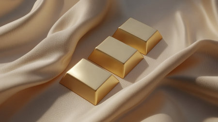 Three gleaming gold bars are elegantly displayed on soft fabric, symbolizing luxury and wealth. The composition highlights sophistication and opulence.