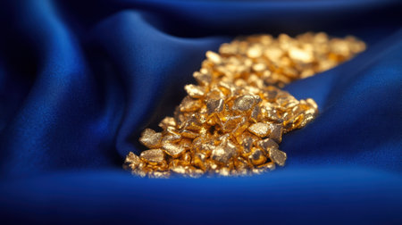 A stunning close-up of glimmering gold nuggets beautifully arranged on a luxurious blue silk fabric, creating a captivating visual of elegance and wealth.