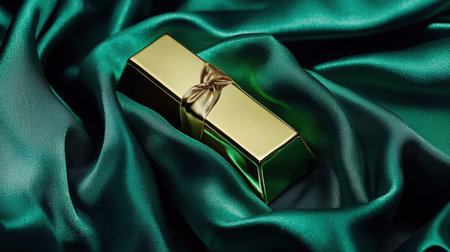A striking gold gift bar elegantly rests on lush green satin, creating a luxurious aesthetic ideal for branding, holidays, and special occasions.