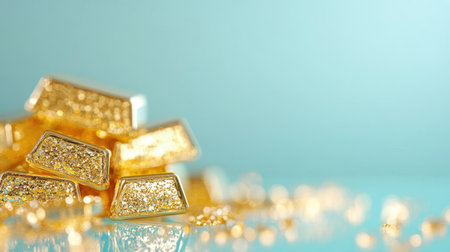 A stunning close-up image showcases beautifully stacked gold bars, radiating wealth and opulence, set against a soft blue background with sparkling dust.