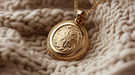 Close-up image of an elegant gold locket pendant featuring an intricate floral design resting on a soft knitted fabric, highlighting luxury and charm.