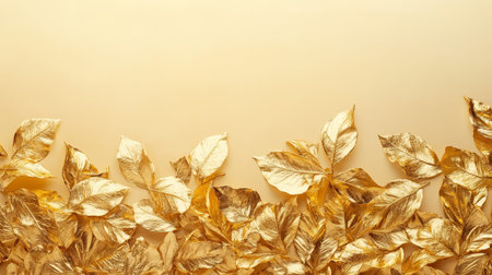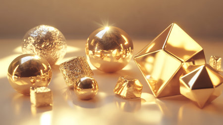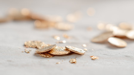 A visually appealing arrangement of scattered golden fragments on a smooth surface, perfect for use in luxury design projects or creative artwork.