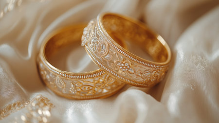 Close-up of a pair of Indian gold bangles with delicate filigree work and traditional patterns, placed on a soft fabric to emphasize their luxurious appeal