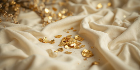 Hyper-Realistic Gold Leaf Fragments Scattered on a Soft Creamy White Velvet Surface A luxurious and artistic abstract composition featuring delicate