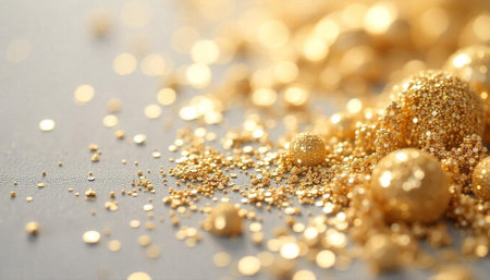 Golden spheres and sprinkles on neutral background closeup shot