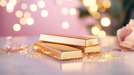 A stunning arrangement of three gold bars resting on a reflective surface, adorned with soft bokeh lights and delicate rose accents, evokes luxury and beauty.