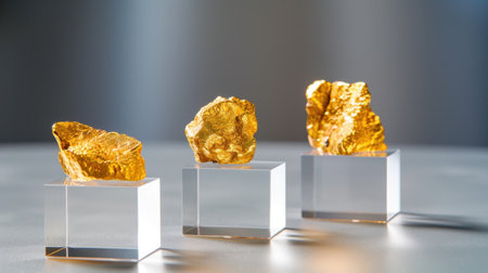 This captivating image showcases exquisite gold nuggets elegantly presented on transparent acrylic stands, highlighting their natural beauty and rich texture.