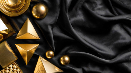 This captivating image features a collection of elegant gold shapes set against a sleek black fabric. Perfect for design inspiration or decor themes.