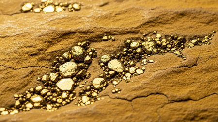 An extreme close-up shot revealing raw gold nuggets of various sizes embedded within a rough, sandy-colored rock. The gold pieces are irregular in shape and possess a natural, unpolished sheen, reflecting light with a warm, golden hue. The surrounding rock has a textured, earthy surface with fine cracks and variations in color, ranging from light tan to deeper brown. The composition highlights the natural beauty and raw form of the precious metal in its geological context.