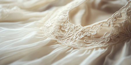Captivating white lace fabric draped softly, adorned with delicate floral accents, perfect for wedding themes and fashion photography accents.