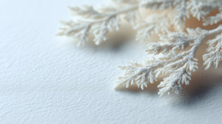 A close-up view of delicate frosted leaves resting on a soft white background, capturing the essence of winter's beauty and serenity in a minimalistic design.