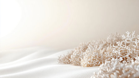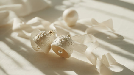 A serene composition featuring delicate white bells and soft ribbons atop a gentle fabric surface, illuminated by soft natural light, evoking holiday elegance.