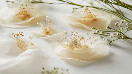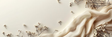 Arrangement of dried flowers, pale beige and cream in color, sits gently on a backdrop of flowing sheer fabric. The fabric has a soft, almost translucent quality, with subtle folds and undulations. The flowers are in sharp focus, and their delicate structure and texture are clearly visible, while the fabric is softly blurred in the background. The lighting is soft and diffused, casting gentle shadows on the fabric. The overall impression is one of serenity and beauty.