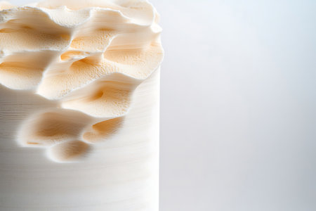 This image features a close-up of soft creamy textures on a cylindrical form, showcasing the delicate layers and organic shapes on a light background.