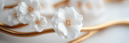 Delicate White Porcelain Flowers on a Curved Gold Branch, Soft Shadows, Neutral White Backdrop