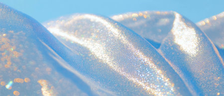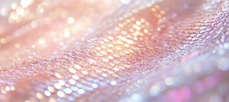 A vibrant soft pastel fabric features an iridescent shine and glittery texture, creating a dreamy and ethereal background perfect for artistic projects.