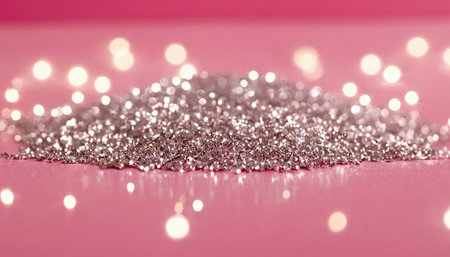 Silver glitter sparkles on a pink background with bokeh.