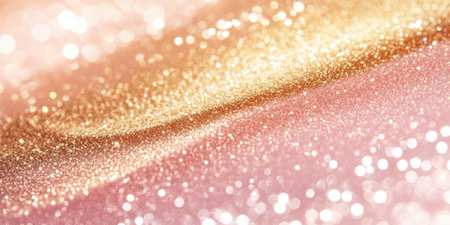 A soft focus background filled with shimmering golden and rose gold glitter and gentle bokeh lights creating a warm and glow.