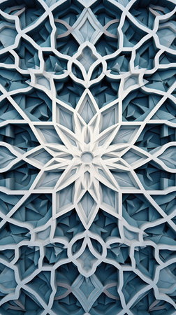 A detailed and intricate Islamic geometric pattern fills the frame with repeating star and polygon shapes in blue and white tones.