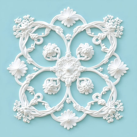 An overhead view displays intricately designed white lace doilies and a central hexagonal shape, all positioned against a vibrant blue background. The delicate patterns showcase detailed texture and symmetry. This composition, illuminated with soft lighting, would be suitable for various design projects and commercial purposes.