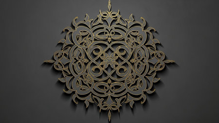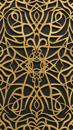 A detailed golden arabesque pattern with repeating floral is set against a dark charcoal background, forming an intricate and symmetrical