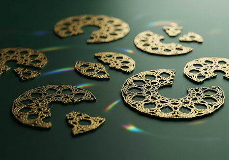 Intricately designed golden crescent shapes arranged on a dark green surface with rainbow reflections