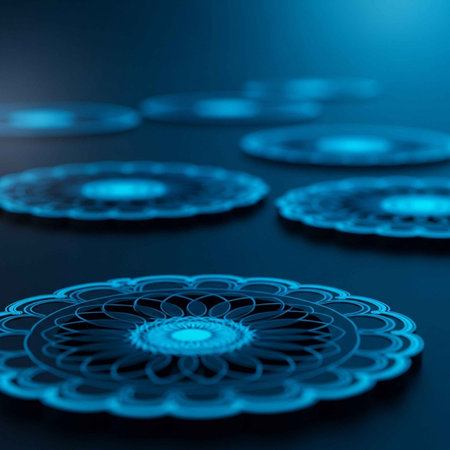 A close-up view of intricate blue circular designs on a dark surface
