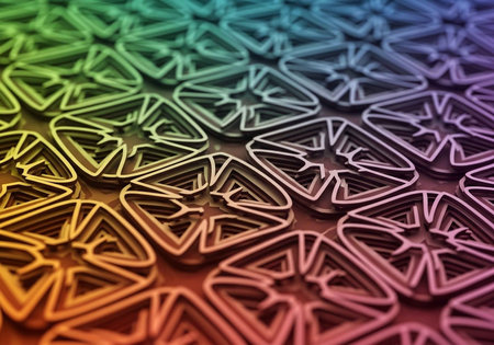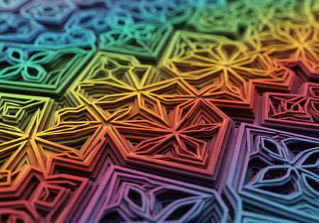 Close-up of intricate, colorful geometric patterns in a rainbow gradient.