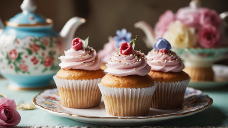 Three delightful cupcakes with pastel frosting and floral decor sit on a vintage plate, surrounded by elegant teacups and blooms, creating a charming tea party vibe.