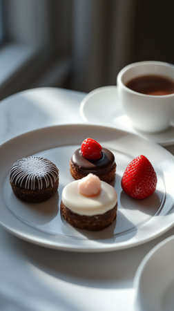 Three elegant pastries topped with chocolate, cream, and fruit sit on a white plate beside a steaming cup of coffee in soft morning light, creating a delightful breakfast setting.