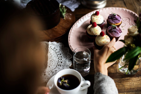 A group of people sitting at a table with cupcakes. AI generative image.