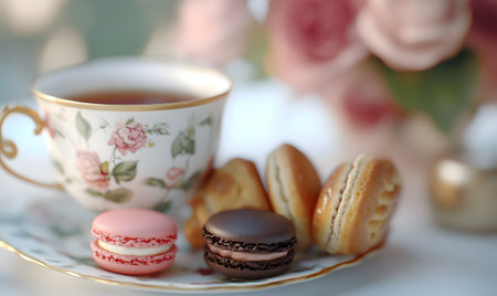 An elegant tea setup with a cup of tea, macarons, and flowers on a dark background. Ideal for themes of relaxation, elegance, and afternoon tea.