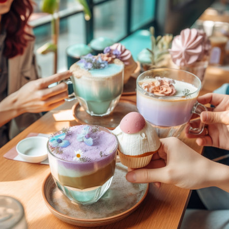 Drinking coffee and eating desserts together. Top view of hands of three beautiful women holding plates with delicious cakes desserts in cafe. Meeting of best friends. Coffee with cakes
