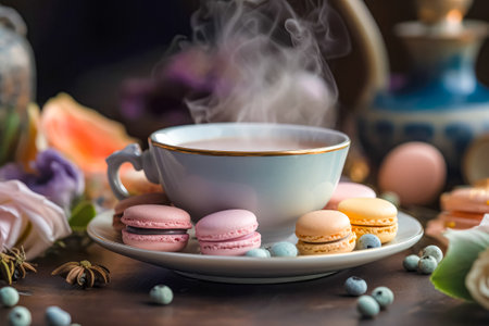 Macarons with cup of tea. AI generated.