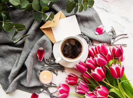 Beautiful tulips and cup of tea on table, closeup. International Women's Day celebration