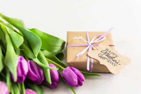 Small gift and purple tulips for Mother's Day.