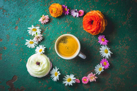 White porcelain cup with black tea and marshmallows. Branches of a blossoming apple tree lie on a beige background. Spring concept. Baner