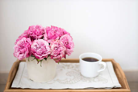 Pink roses in a white tin bucket on a beige napkin and a cup with tea. Copy space