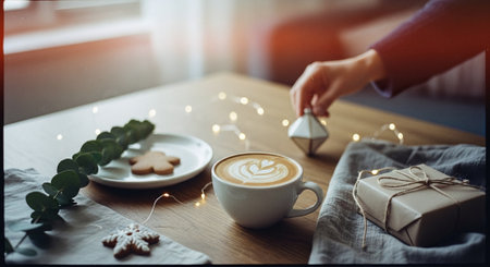A cozy scene featuring a cup of coffee with latte art, a plate with a gingerbread cookie, a small gift wrapped in brown paper, and decorative lights on a wooden table