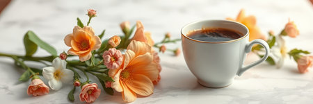 Freshly brewed coffee beside blooming flowers on a marble table in a cozy setting