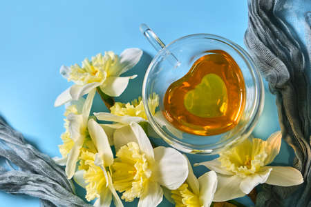 Green tea in a in a heart-shaped glass cup with a double bottom on the napkin with daffodil flowers on blue backgound. Spring still life.