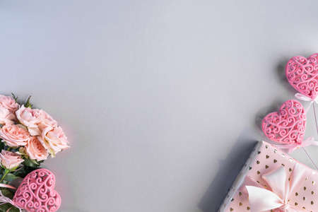 Festive frame with pink roses and a gift on a gray background. Top view, flat lay. Copy space.