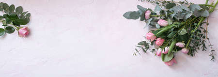 Rose fresh flowers bouquet on gray table flat lay with copy space