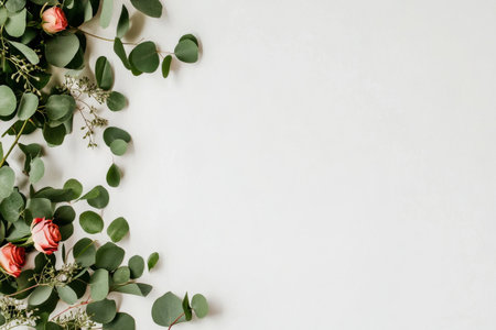 Delicate pink roses accompanied by lush eucalyptus leaves are artistically arranged on a soft light background, enhancing a tranquil and fresh aesthetic.