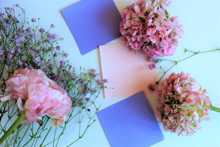Light pink flowers (Ranunculus), lilac flowers and lilac paper on a white background. Background for greetings, invitations, cards. Pastel colors. The view from the top.