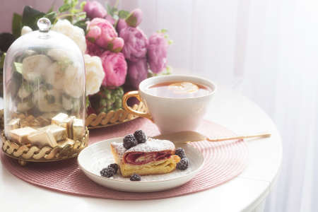 Strudel with fresh berries, flowers and a cup of tea on a pink napkin on a white table. Traditional appetizer or breakfast. Scandinavian-style dishes and terrier.