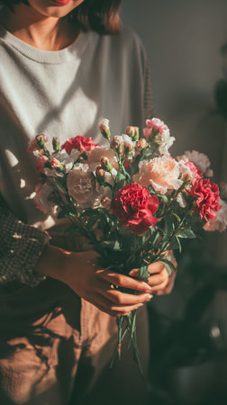 A soft pink and red carnation bouquet held by person in warm sunlight expressing gentle self love and intimate valentine mood