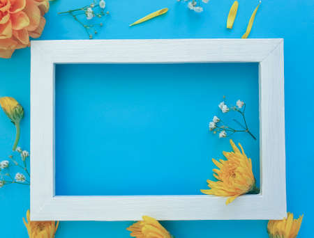 bouquet of colorful spring flowers on blue background, top view