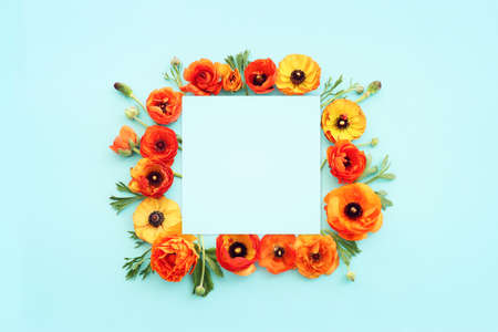 Top view image of yellow buttercup flowers composition over blue pastel background