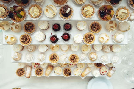 Top view of sweet table for wedding ceremony or birthday. Candy bar with a lot of different candies and sweet cakes. Selective focus. Party and holiday celebration concept